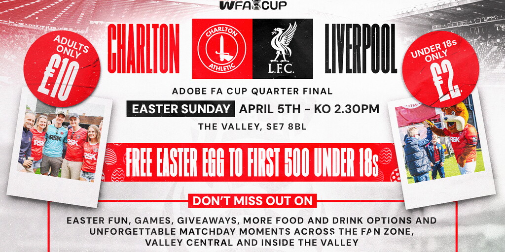 Charlton Athletic Women host Liverpool in the FA Cup quarter-final on Easter Sunday (KO 2.30pm BST). Join Carla Humphrey in the a Q&A and signing session in the Fan Zone, with plenty of activities and Easter-themed fun for all the family to enjoy.